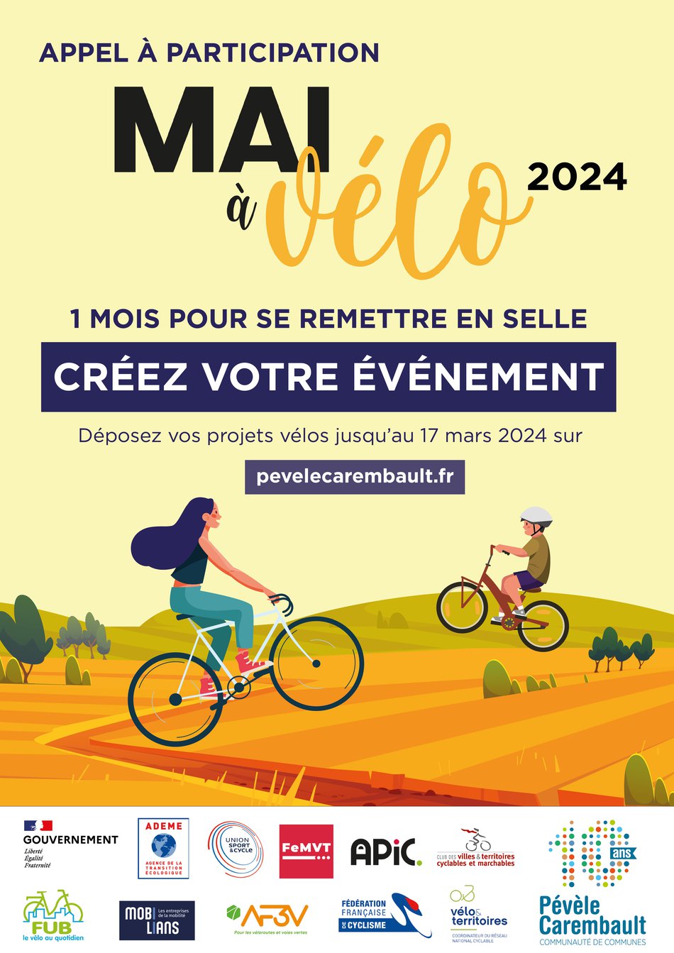 Vous êtes une association, une commune, une entreprise, un collectif, un établissement... Montez votre projet et remplissez le formulaire "Mai à vélo" disponible sur demarches.pevelecarembault.fr avant le 17 mars 2024.