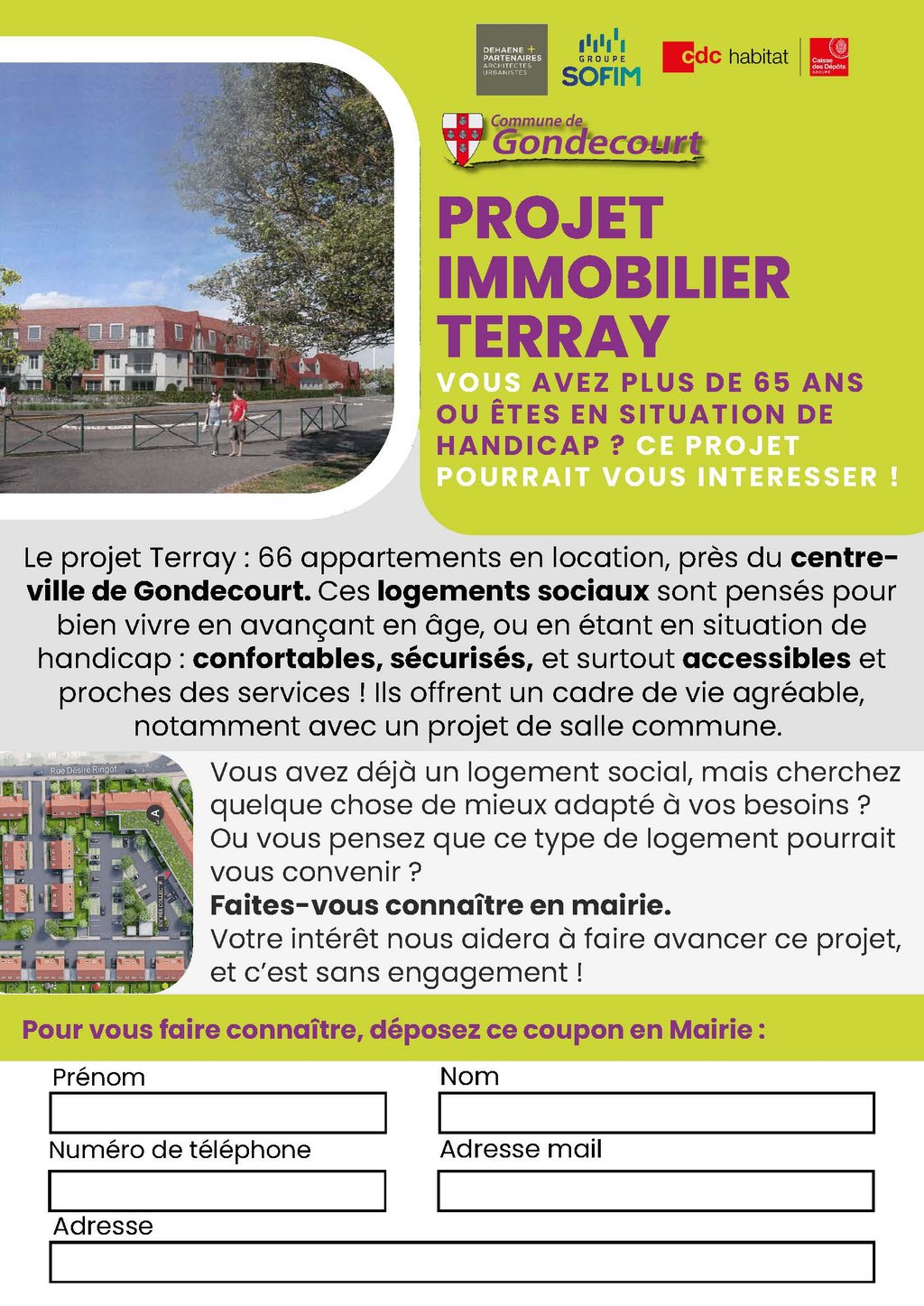 Le projet Terray : 66 appartements en location, près du centre-ville de Gondecourt. Ces logements sociaux sont pensés pour bien vivre en avançant en âge, ou en étant en situation de handicap : confortables, sécurisés, et surtout accessibles et proches des services ! Ils offrent un cadre de vie agréable, notamment avec un projet de salle commune.