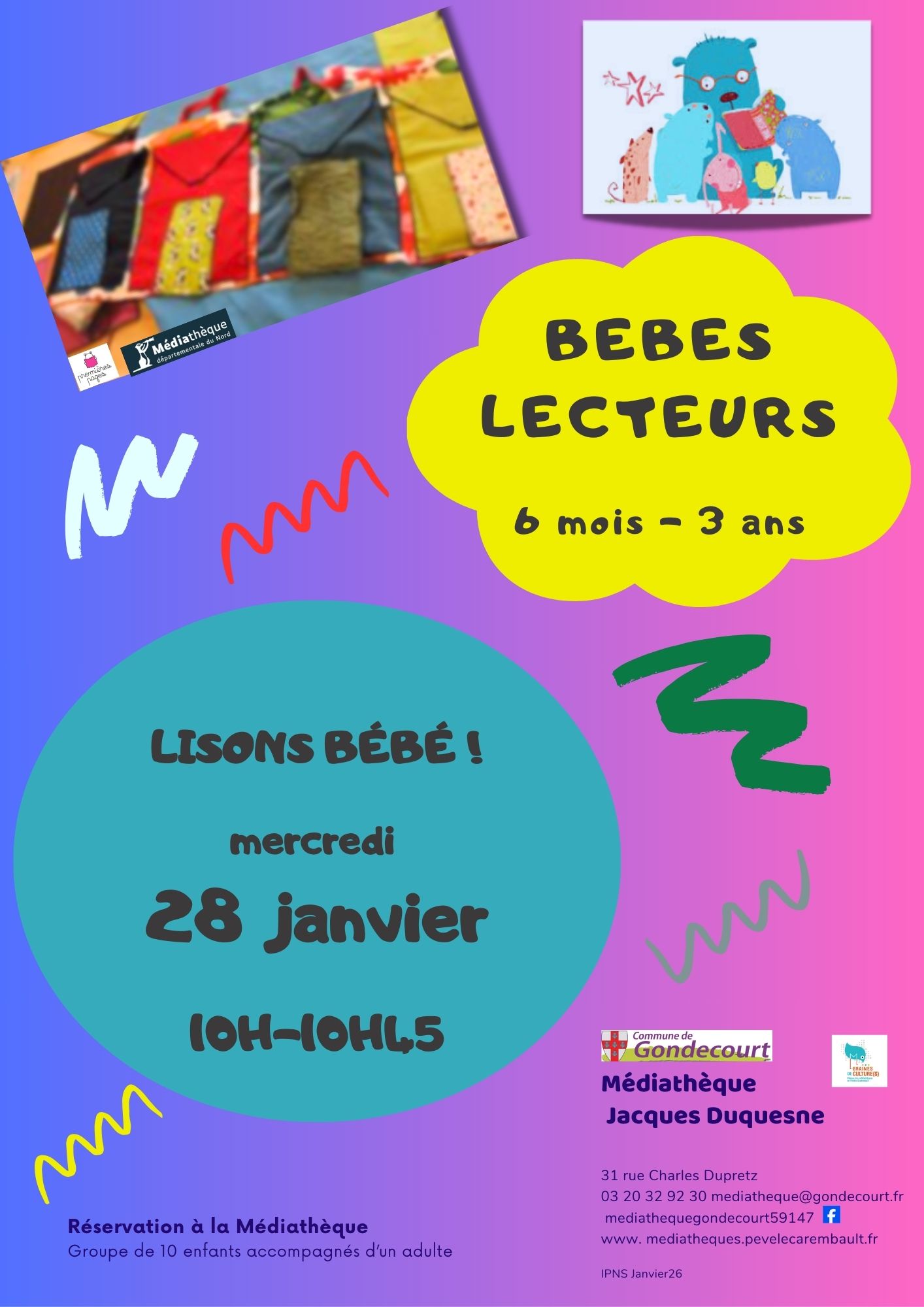 Reprise des séances Bébés Lecteurs dès mercredi 28 janvier à 10h autour du tapis Lisons Bébé.