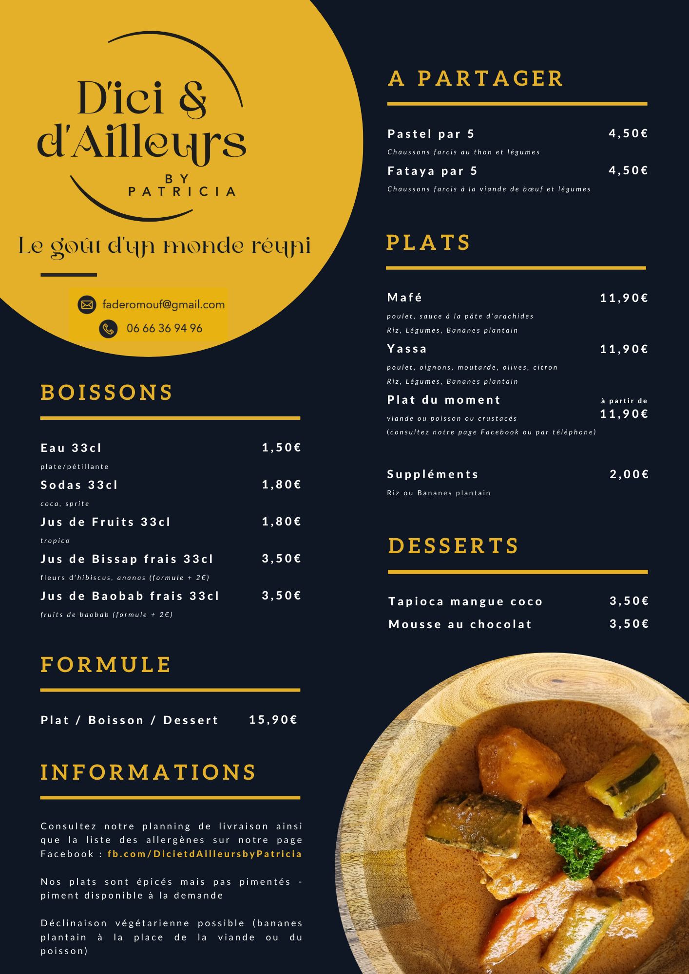 D'ici et d'Ailleurs by Patricia, Traiteur afropéen sucrés et salés propose de vous faire voyager à travers une cuisine aux saveurs des spécialités de l'Afrique de l'ouest, le tout élaboré avec des produits privilégiant la production locale. Originaire du Bénin, je suis diplômée de l'hôtellerie restauration et après 15 ans d'expériences, j'ai effectué une reconversion dans la pâtisserie, domaine dans lequel j'ai exercé pendant 5 ans. J'aurai le plaisir de vous faire partager mon univers culinaire.